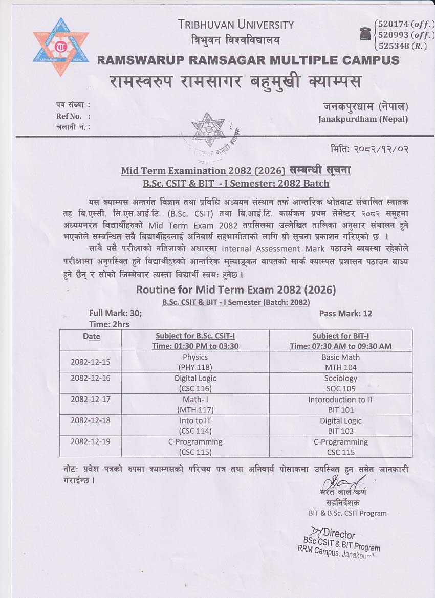 Mid Term Examination 2082 (2026) सम्बन्धी सूचना B.Sc. CSIT & BITI Semester: 2082 Batch