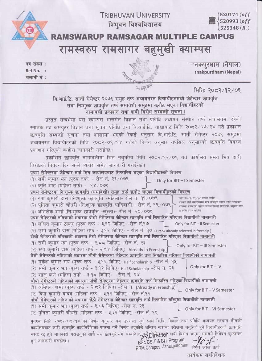 वि.आई.टि. सातौ सेमेष्टर २०७९ समुह तर्फ अध्ययनरत विद्यार्थीहरुमध्ये जेहेन्दार छात्रवृत्ति तथा निःशुल्क छात्रवृत्ति तर्फ समावेशी समुहमा छनौट भएका विद्यार्थीहरुको नामावली प्रकाशन तथा दाबी बिरोध सम्बन्धी सूचना।