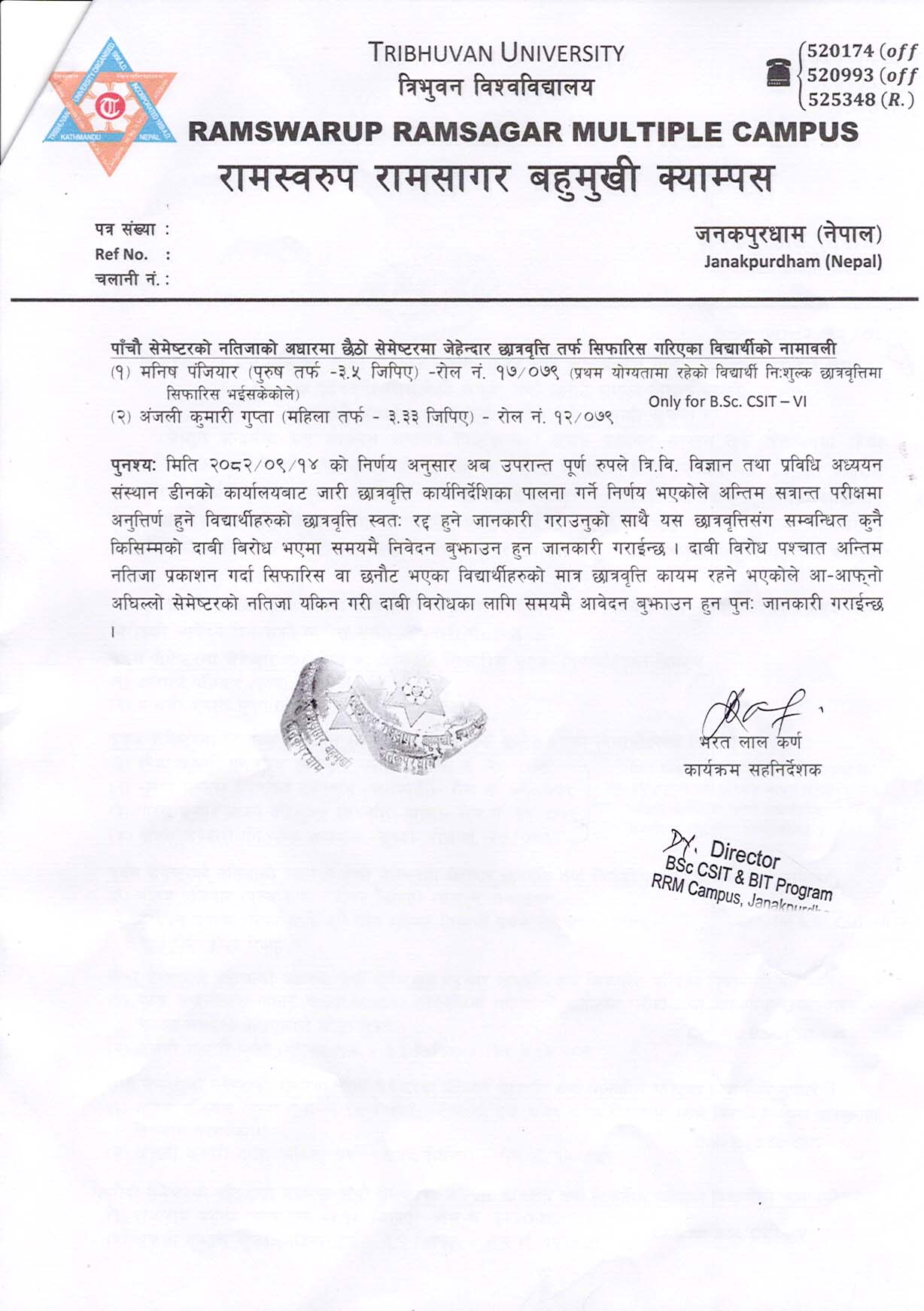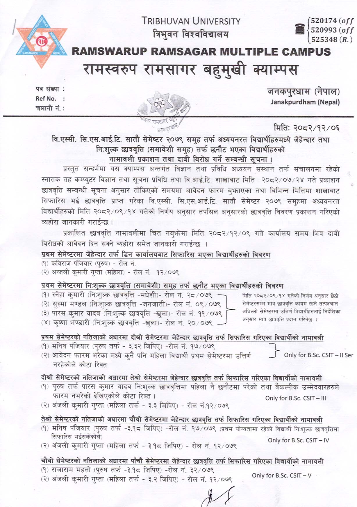 वि.एस्सी. सि.एस.आई.टि. सातौ सेमेष्टर २०७९ समुह तर्फ अध्ययनरत विद्यार्थीहरुमध्ये जेहेन्दार तथा निःशुल्क छात्रवृत्ति (समावेशी समुह) तर्फ छनौट भएका विद्यार्थीहरुको नामावली प्रकाशन तथा दाबी बिरोध गर्ने सम्बन्धी सुचना ।