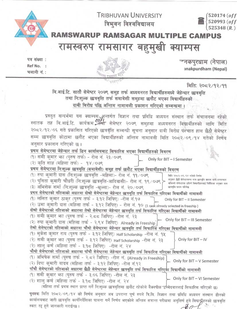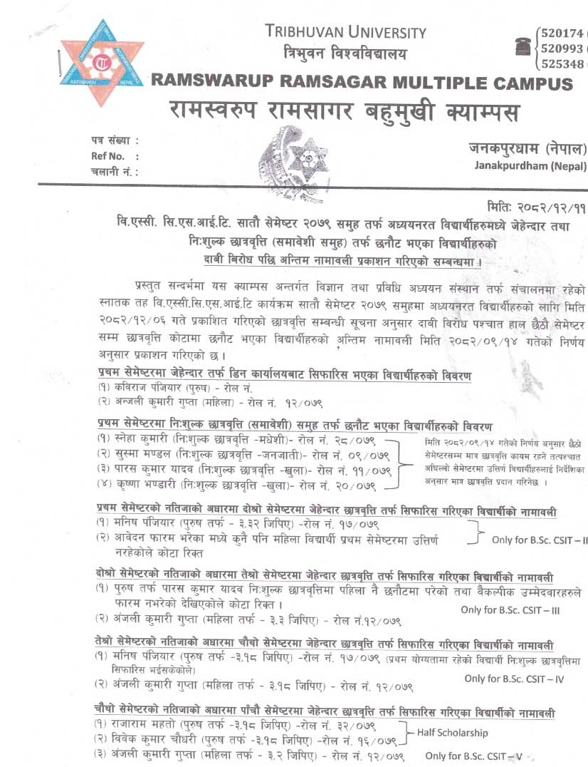 वि.आई.टि. सातौ सेमेष्टर २०७९ समुह र वि.एस्सी. सि.एस.आई.टि. सातौ सेमेष्टर २०७९ समुहतर्फ अध्ययनरत विद्यार्थीहरुमध्ये जेहेन्दार छात्रवृत्ति