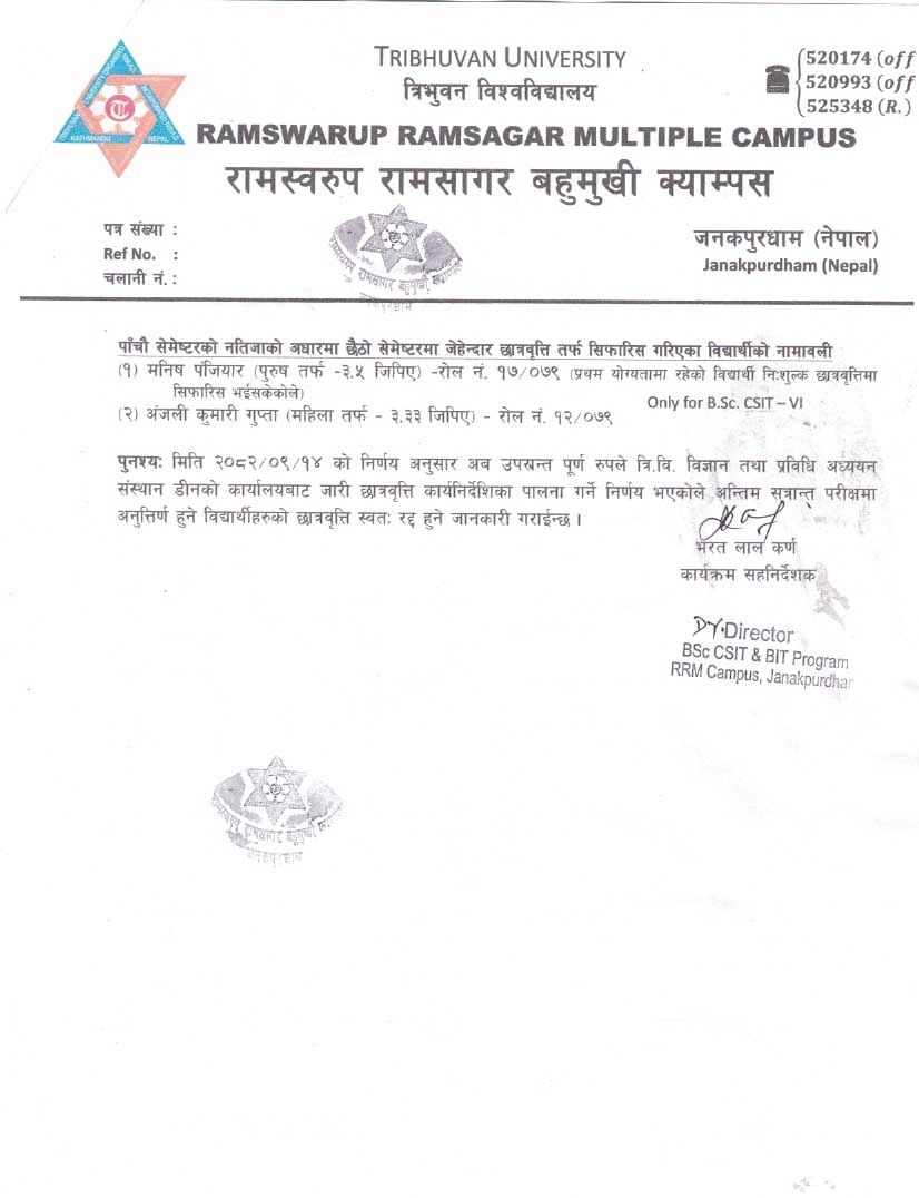पाँचौ सेमेष्टरको नतिजाको अधारमा छैठो सेमेष्टरमा जेहेन्दार छात्रवृत्ति तर्फ सिफारिस गरिएका विद्यार्थीको नामावली