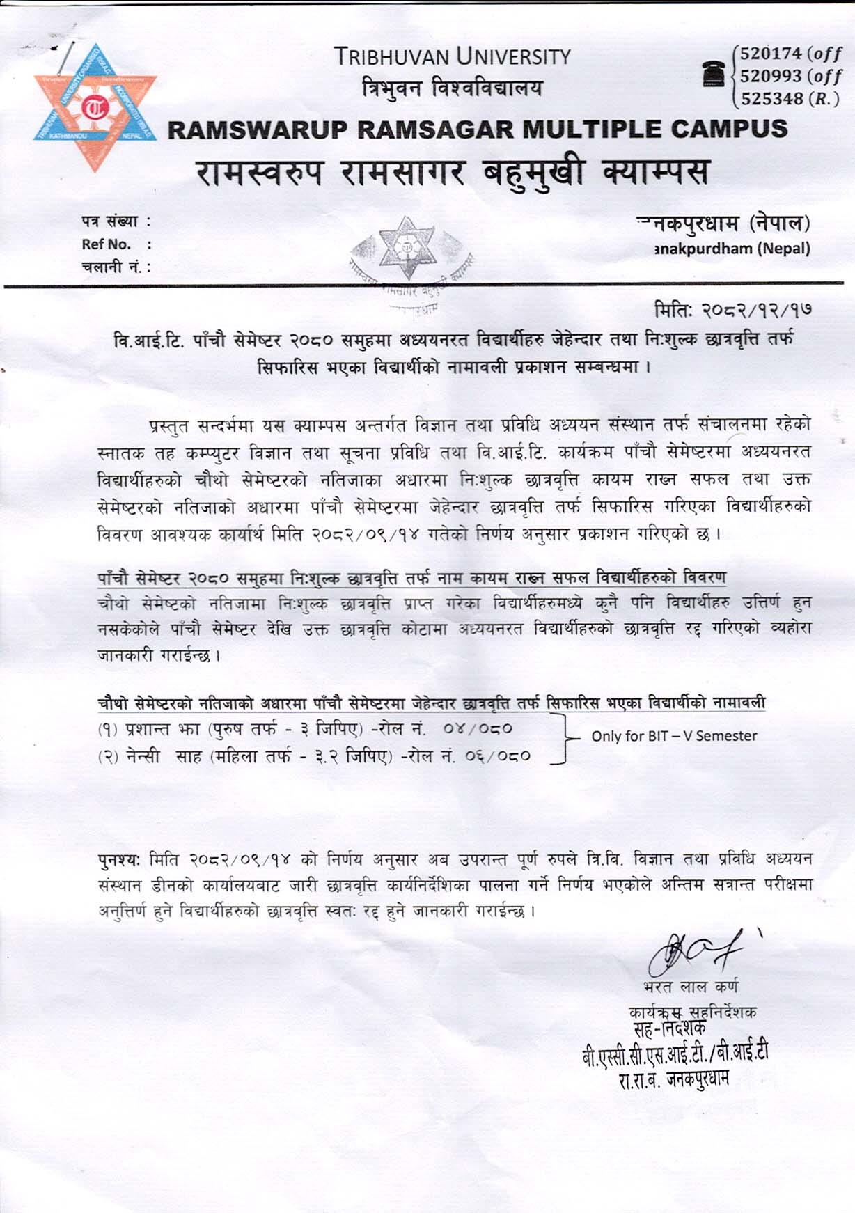 वि.आई.टि. पाँचौ सेमेष्टर २०८० समुहमा अध्ययनरत विद्यार्थीहरु जेहेन्दार तथा निःशुल्क छात्रवृत्ति तर्फ सिफारिस भएका विद्यार्थीको नामावली प्रकाशन सम्बन्धमा ।