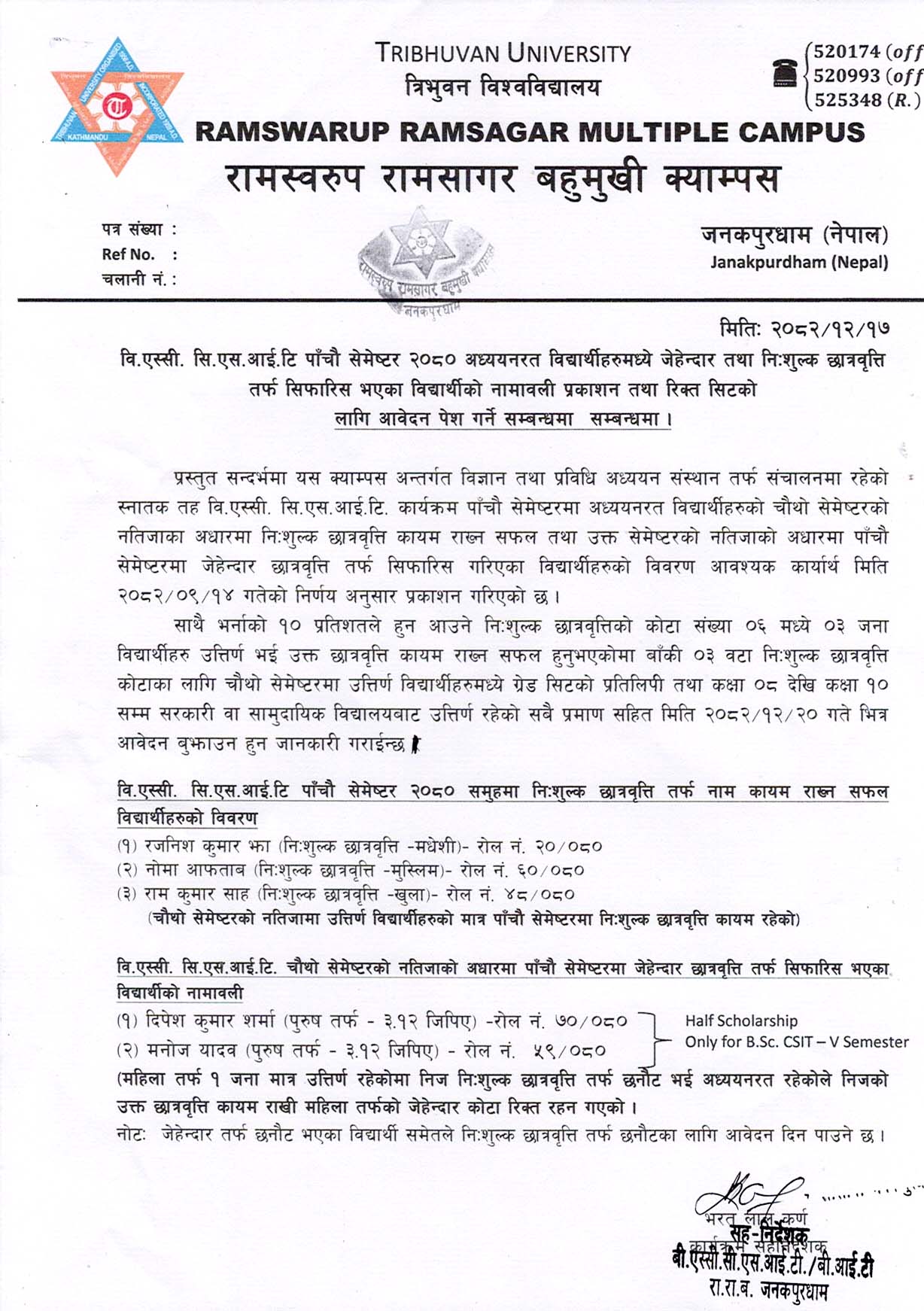 वि.एस्सी. सि.एस.आई.टि पाँचौ सेमेष्टर २०८० अध्ययनरत विद्यार्थीहरुमध्ये जेहेन्दार तथा निःशुल्क छात्रवृत्ति तर्फ सिफारिस भएका विद्यार्थीको नामावली प्रकाशन तथा रिक्त सिटको लागि आवेदन पेश गर्ने सम्बन्धमा सम्बन्धमा ।