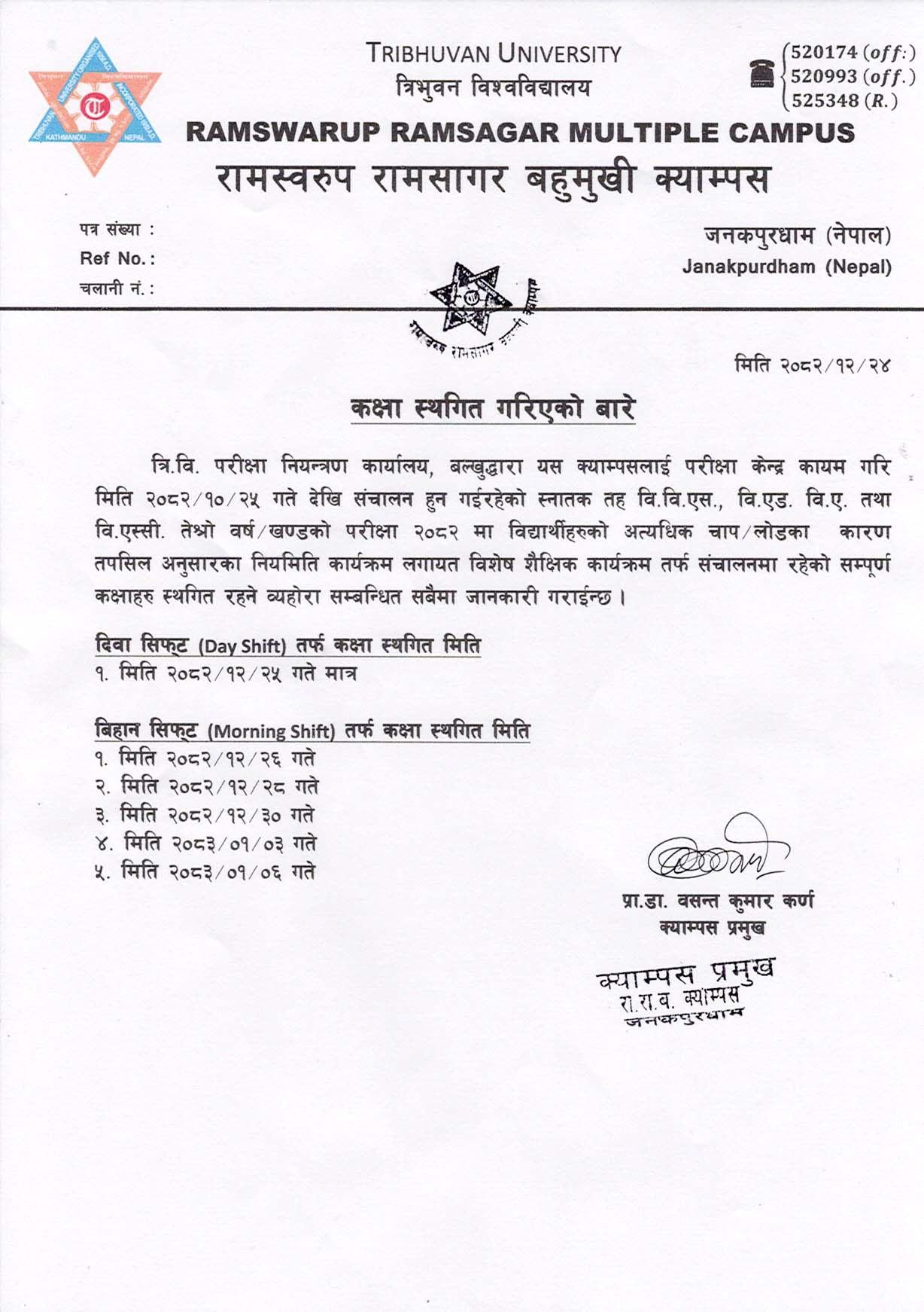 बिहान सिफ्ट (Morning Shift) तर्फ कक्षा स्थगित मिति
