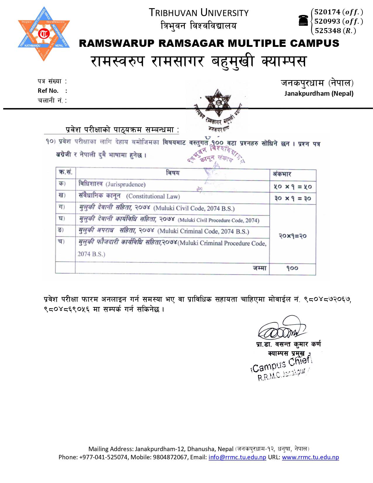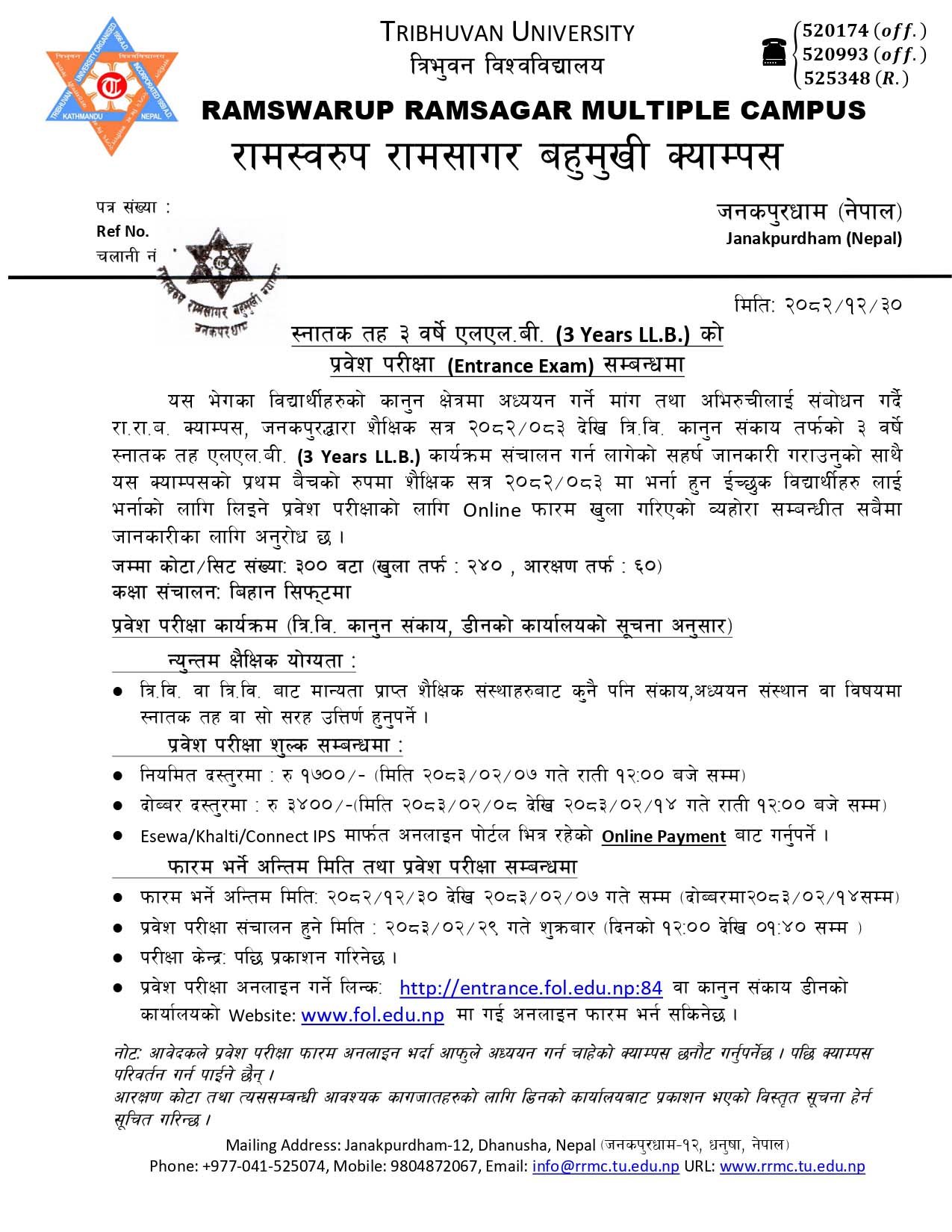 शैक्षिक सत्र २०८२/०८३ मा स्नातक तह 3 Years LL.B. कार्यत्रममा भर्नाका लागि प्रवेश परीक्षा फारम भर्ने भराउने बारे सूचना ।