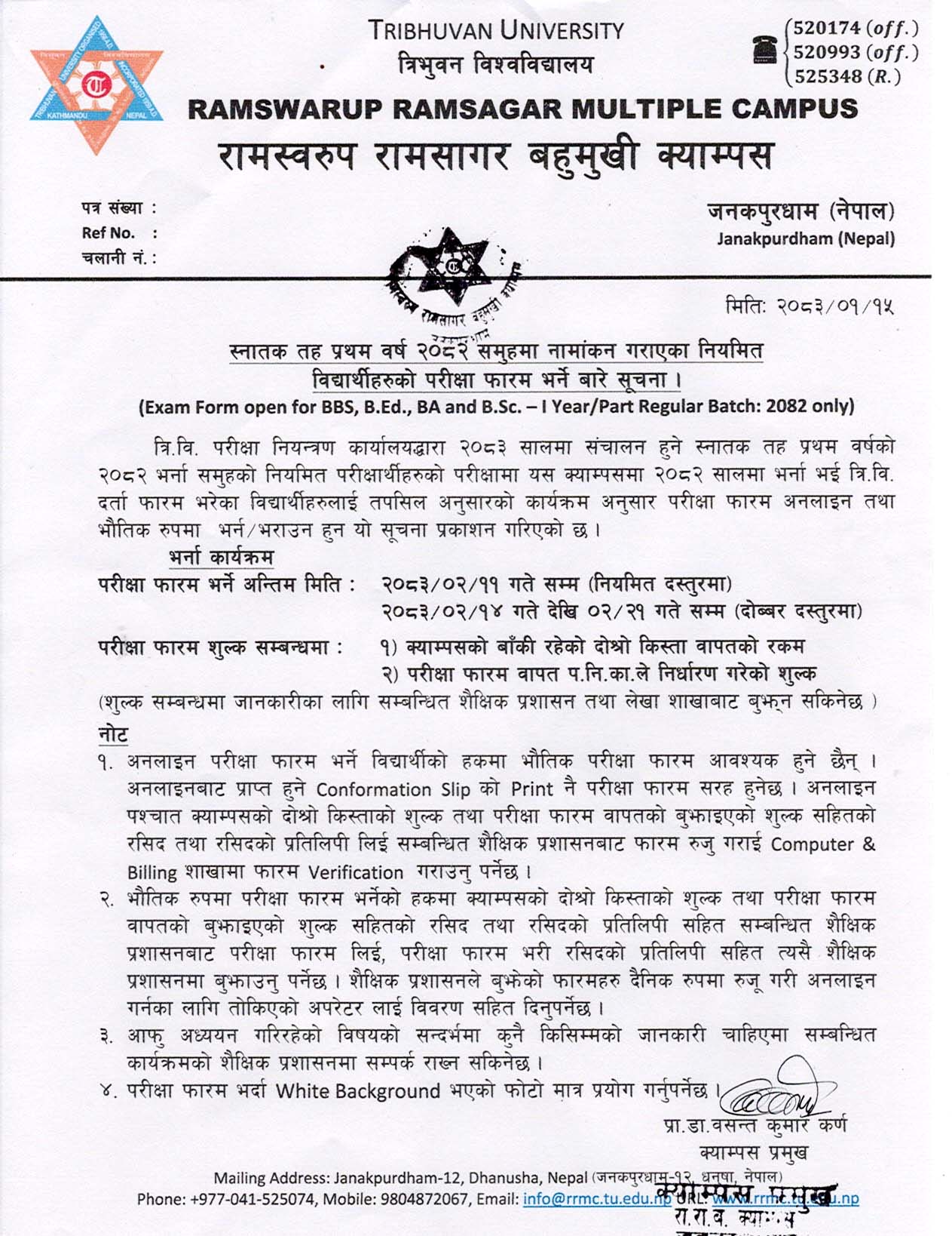 स्नातक तह प्रथम वर्ष २०८२ समुहमा नामांकन गराएका नियमित विद्यार्थीहरुको परीक्षा फारम भर्ने बारे सूचना । ( Exam Form open for BBS, B.Ed., BA and B.Sc. -1 Year/Part Regular Batch: 2082 only)