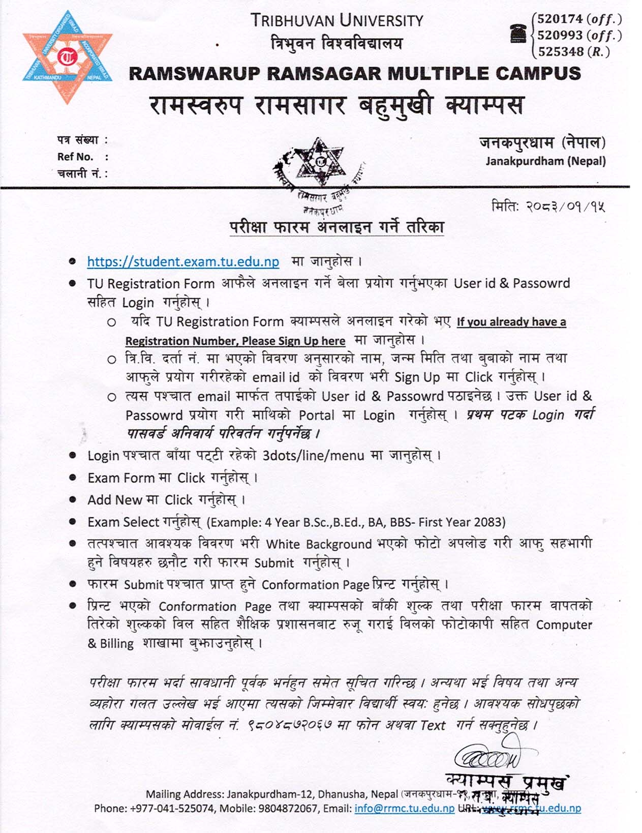 स्नातक तह प्रथम वर्ष २०८२ समुहमा नामांकन गराएका नियमित विद्यार्थीहरुको परीक्षा फारम भर्ने बारे सूचना ।