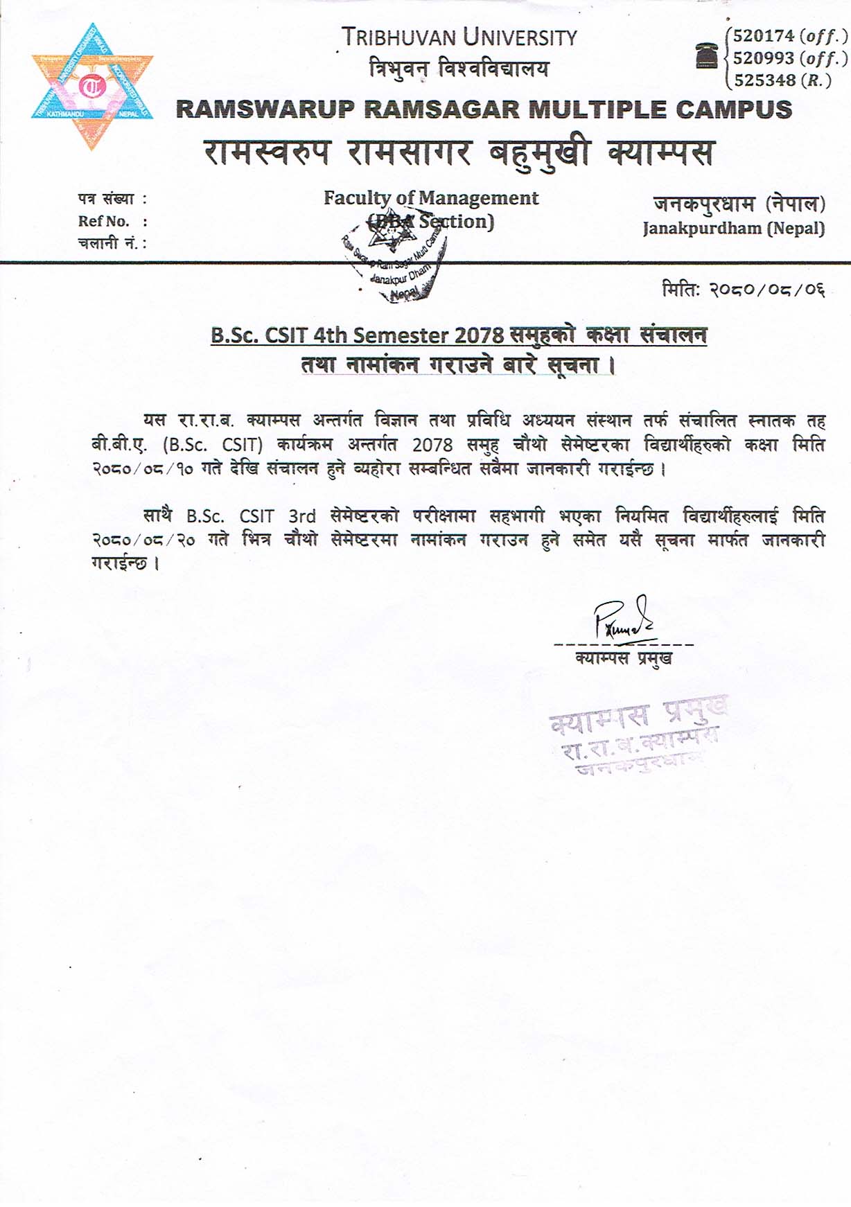 B.Sc. CSIT 4th Semester काे कक्षा संचालन बारे सूचना ।