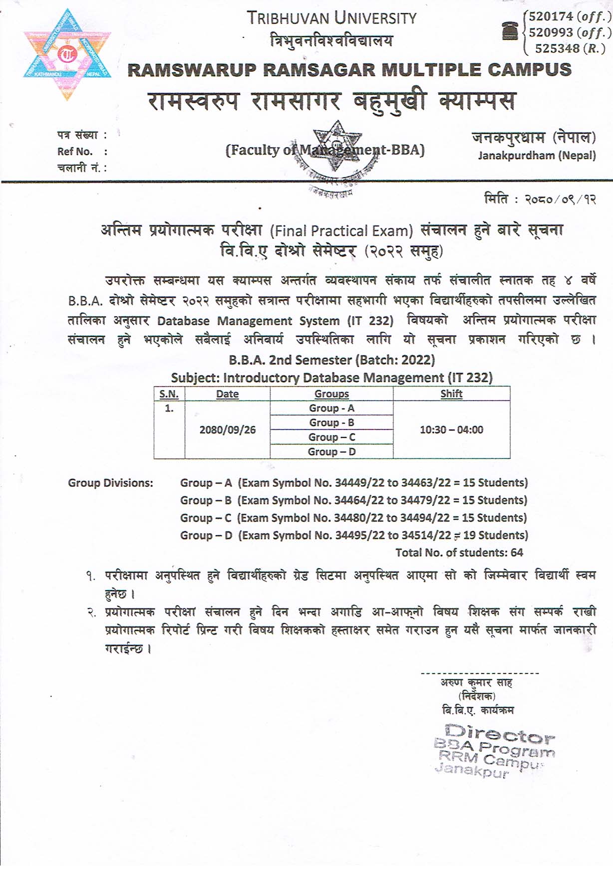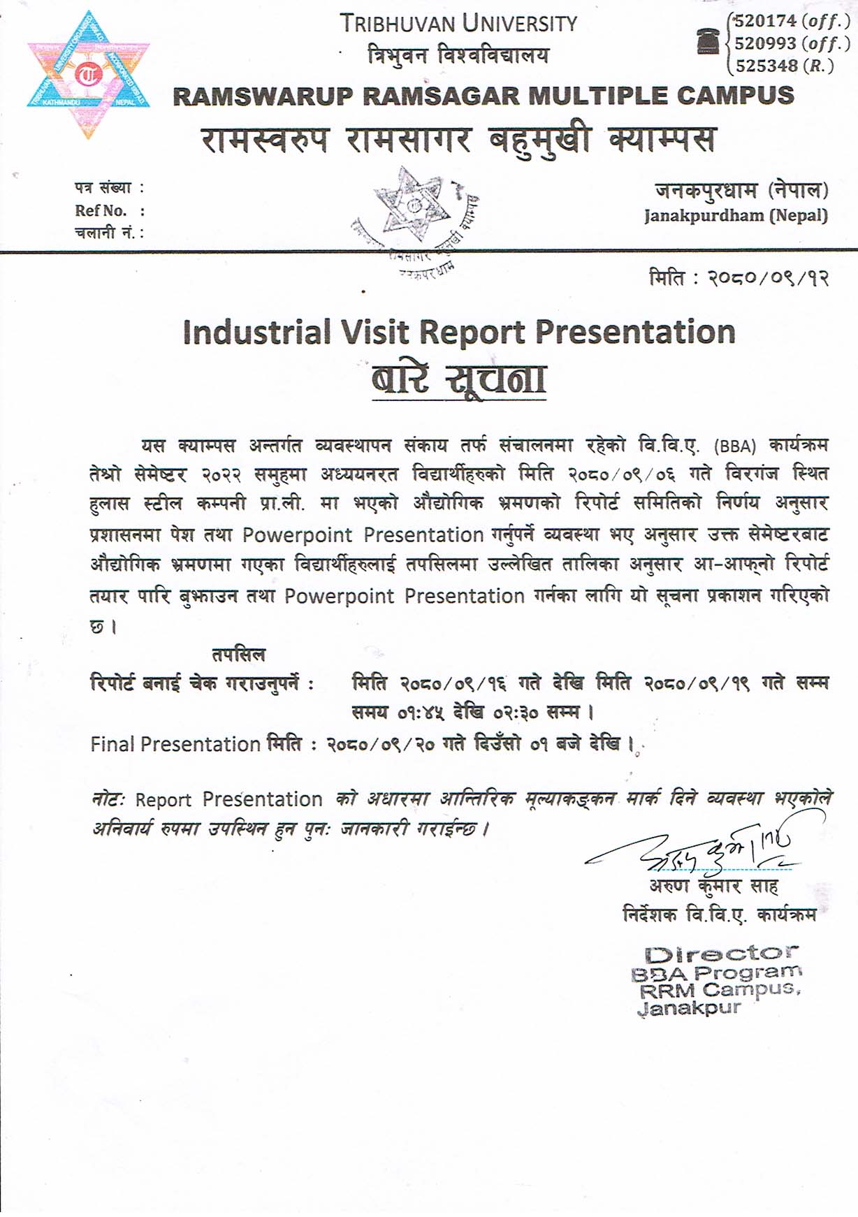 BBA 2nd Semester 2022 समुहका विद्यार्थीहरूकाे Industrial Visit Report तथा DBMS काे प्रयाेगात्मक परीक्षा संचालन सम्बन्धी सूचना ।