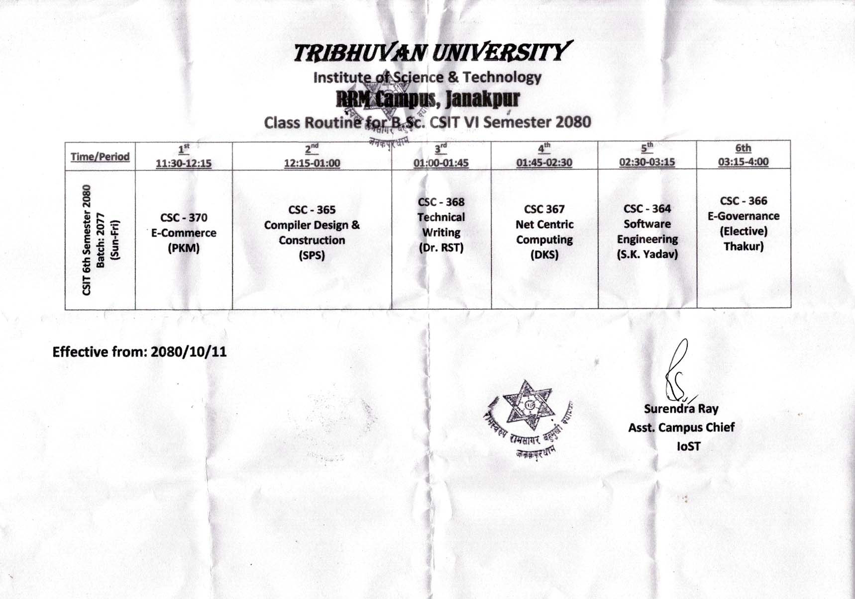 Class Routine CSIT 6th Sem Effective from 2080/10/11