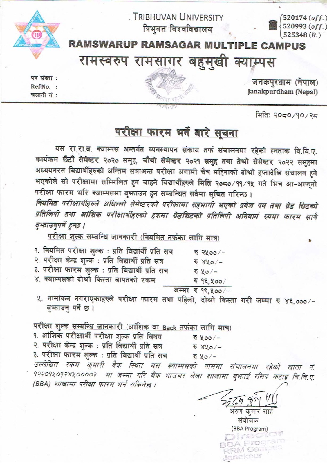BBA 3rd, 4th and 6th Semester काे परीक्षा फारम भर्ने बारे सूचना ।