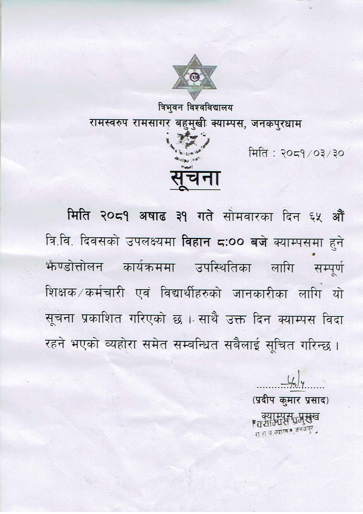 TU Registration Notice for Masters Level Student; Batch: 2082