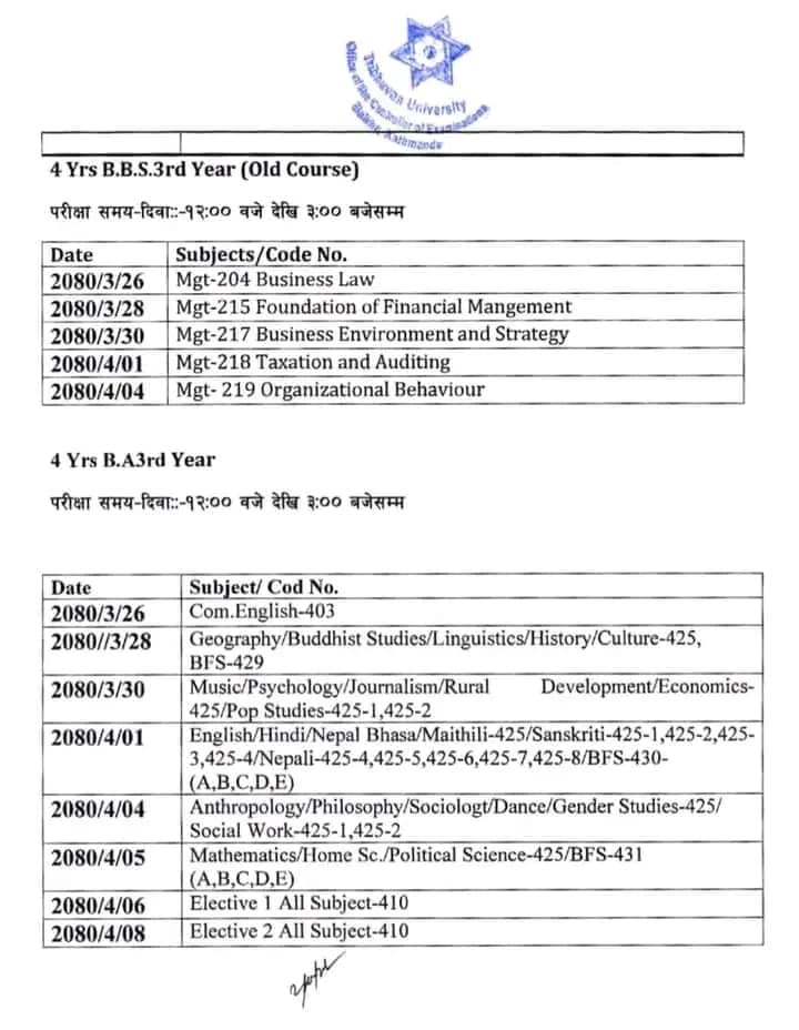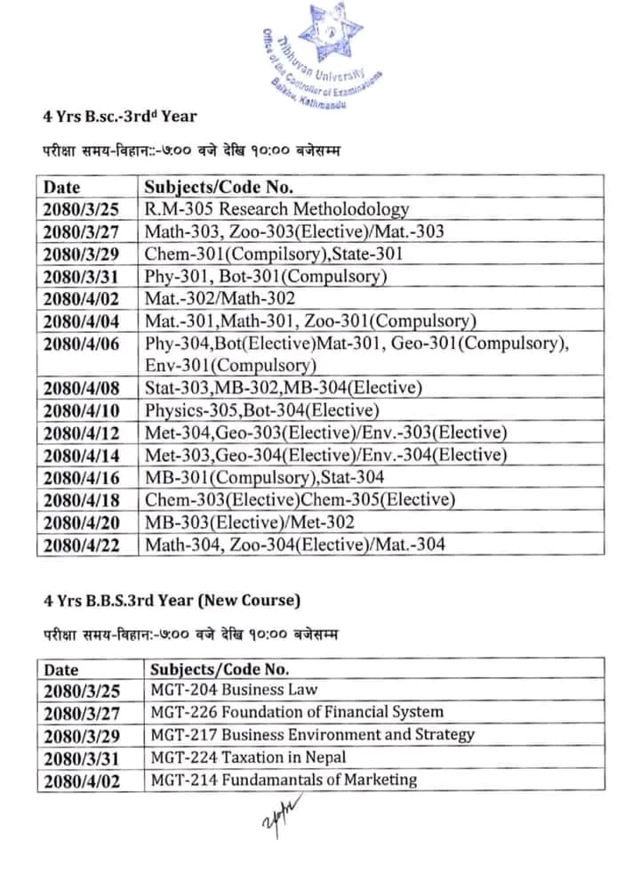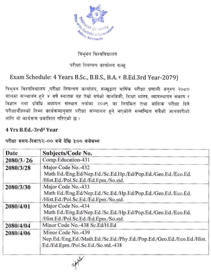 त्रिभुवन विश्वविद्यालय, परीक्षा नियत्रंण कार्यालयकाे मिति २०८०/०३/२६ गतेदेखि संचालन हुने गरी स्नातक तह तेश्राे खण्डकाे परीक्षा तालिका सार्वजनिक गरेकाे व्यहाेरा सम्बन्धित सबैमा जानकारी गराइन्छ ।