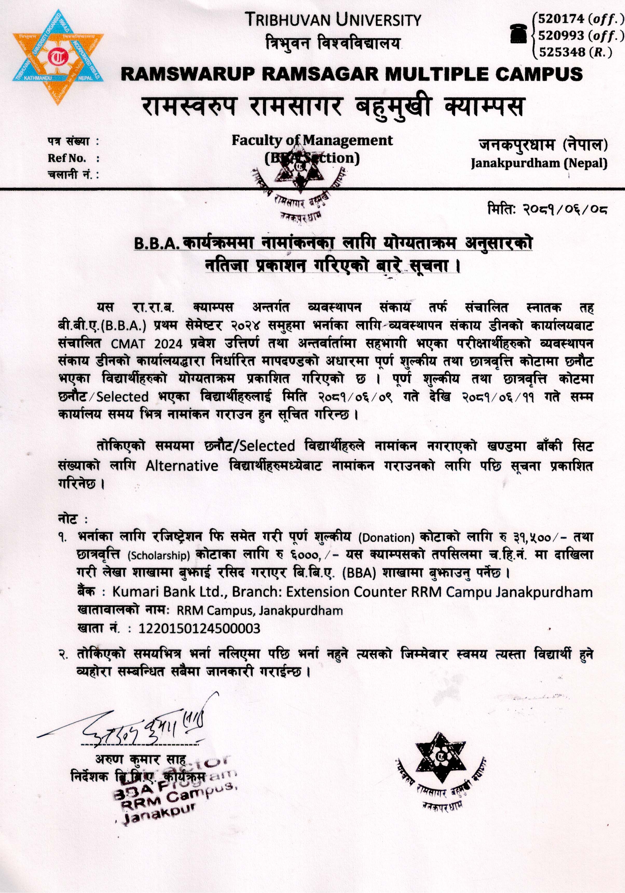 BBA 2081 सालमा नामांकनका लागि छात्रवृत्ती तथा पूर्ण शुल्कीय तर्फका याेग्यताक्रम अनुसारकाे नतिजा प्रकाशन गरिएकाे बारे सूचना ।