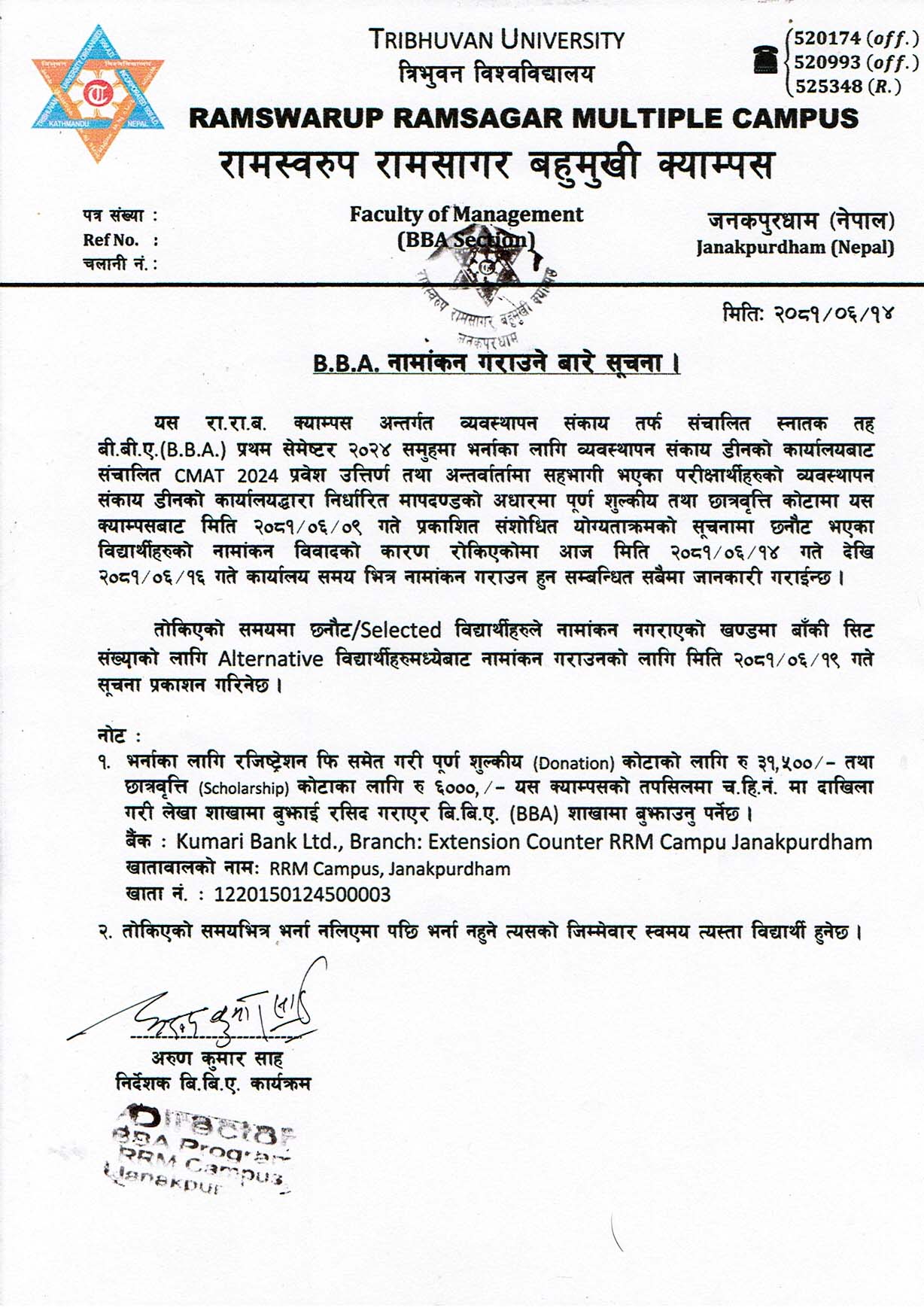 स्नातक तह प्रथम वर्ष २०८२ समुहको परीक्षा फारम सम्बन्धमा