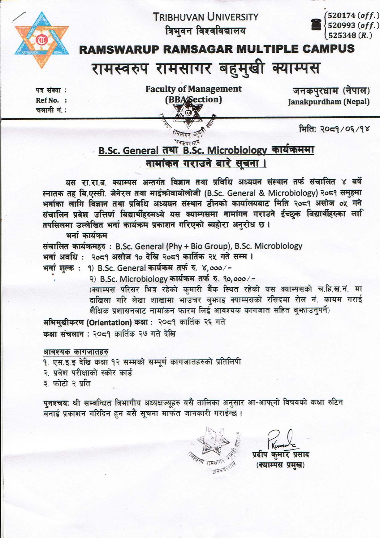 B.Sc. General तथा B.Sc. Microbiology मा भर्ना सम्बन्धी सूचना ।