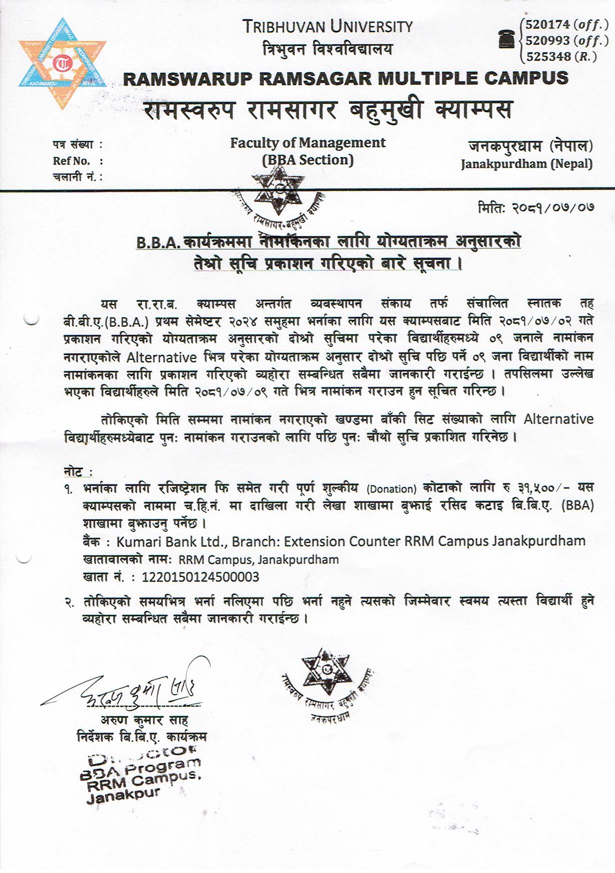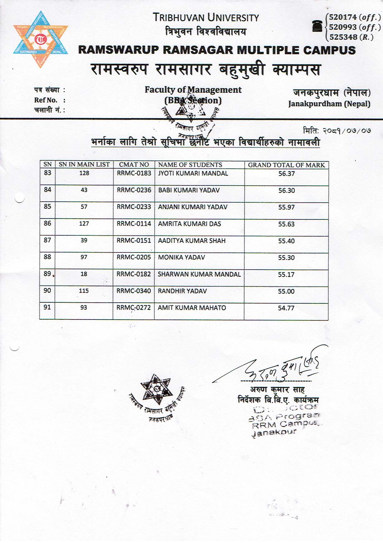 BBA 2081 समुहमा नामांकनका लागि तेश्राे याेग्यतात्रमनुसारकाे सुची तल संलग्न छन् ।
