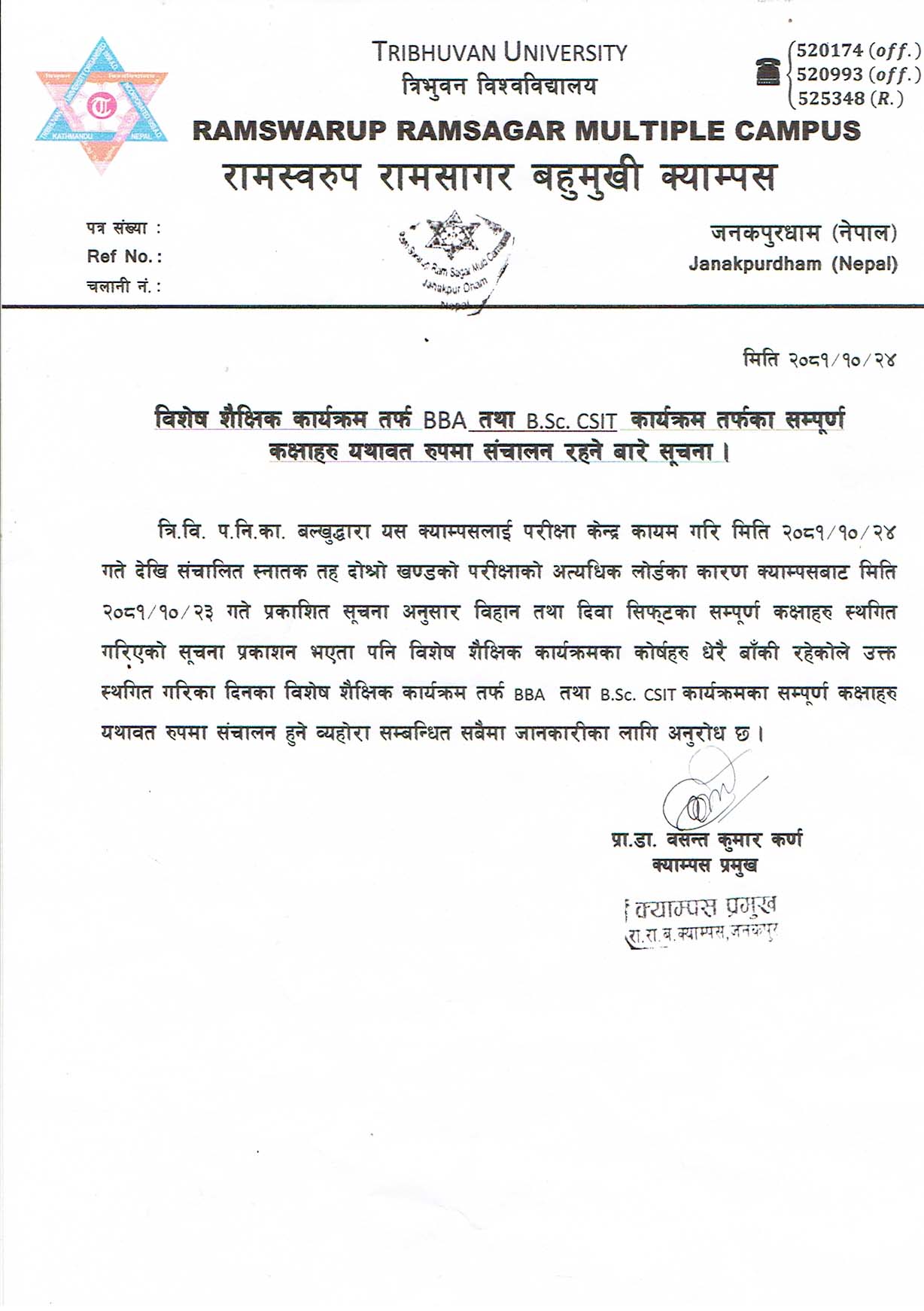 BBA तथा B.Sc. CSIT तर्फका कक्षाहरू यथावत रूपमा संचालन हुने बारे सूचना ।
