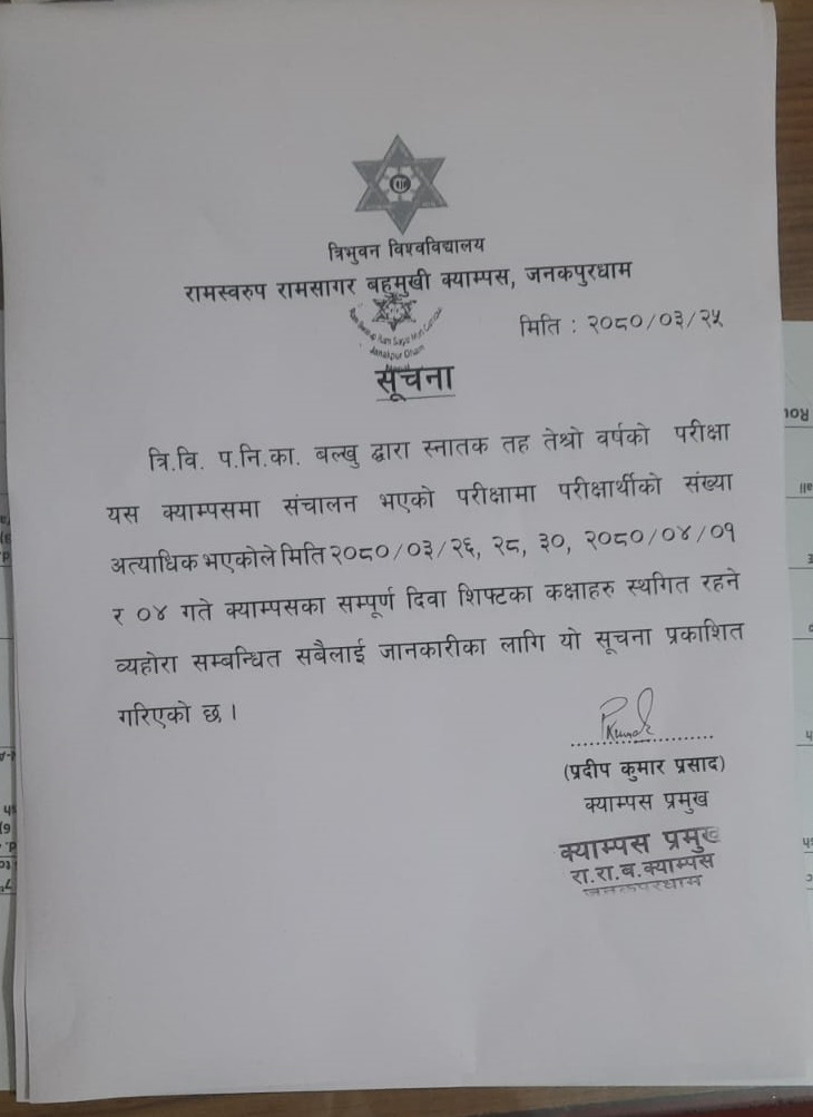 स्नातक तह तेश्रो खण्डको परीक्षाको अत्यधिक चापका कारण दिवा सिफ्टका BBA & B.Sc. CSIT बाहेकका कक्षाहरु स्थगित गरिएको व्यहोरा सबैमा जानकारी गराईन्छ ।