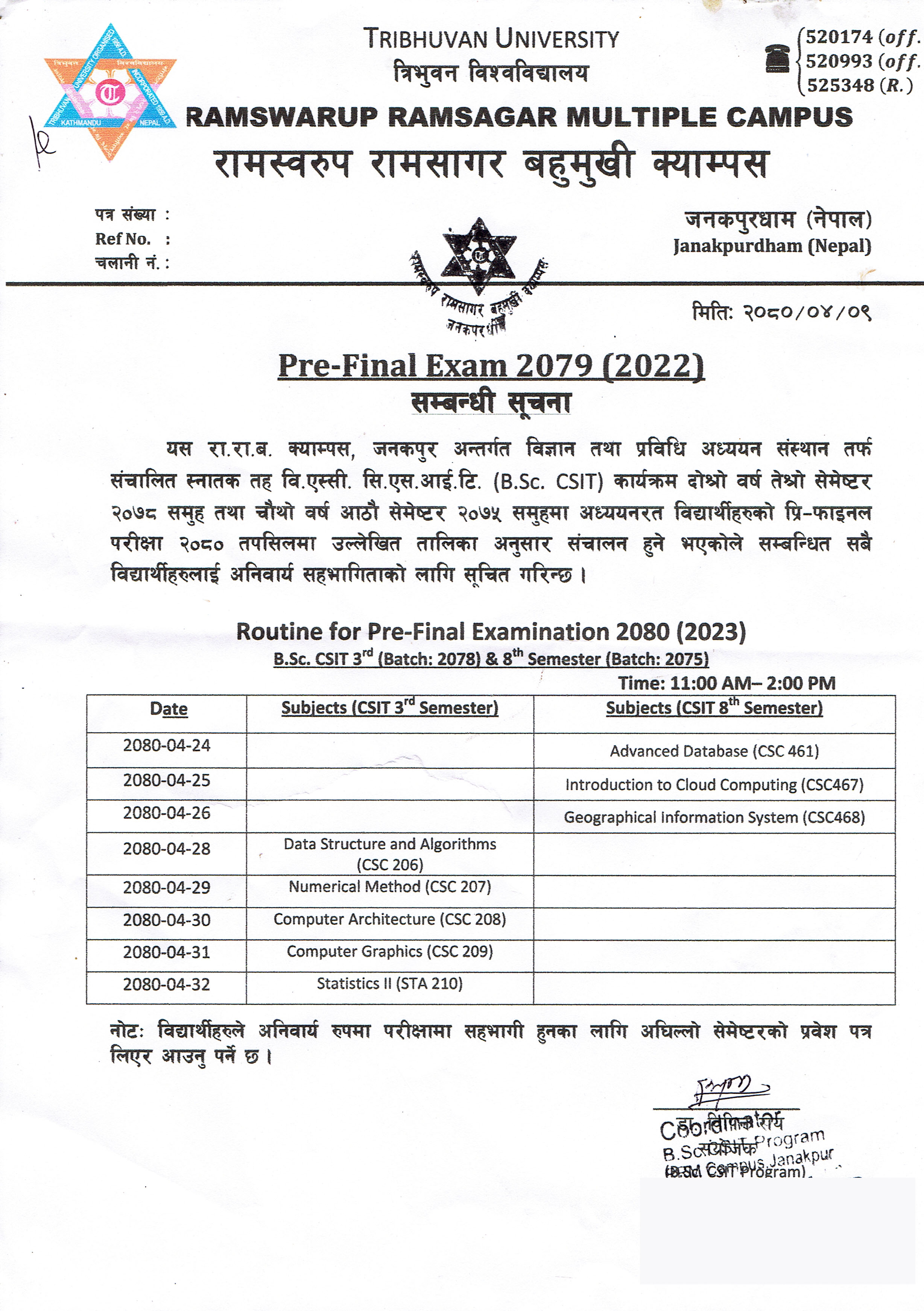 B.Sc. CSIT 3rd Semester and CSIT 8th Semester काे Pre-Final परीक्षाकाे तालिका सार्वजनिक गरिएकाे छ ।