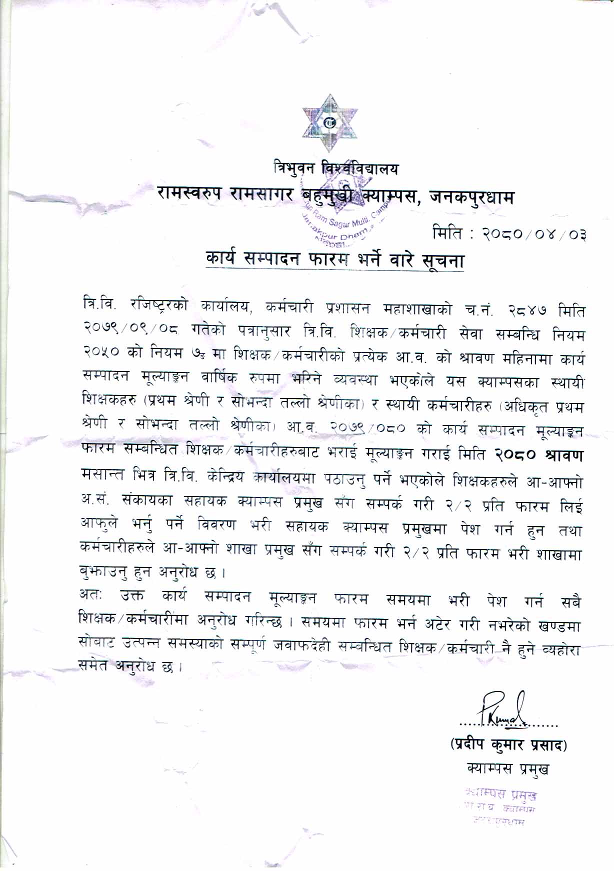 कार्य सम्पादन तथा मुल्याङ्कन फारम भर्ने बारे सूचना