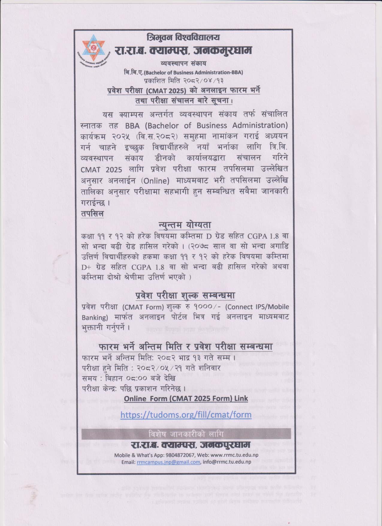३ वर्षे स्नातक तह वि. एस्सी. दोश्रो तथा प्रथम खण्डको मौका परीक्षा फारम सम्बन्धमा