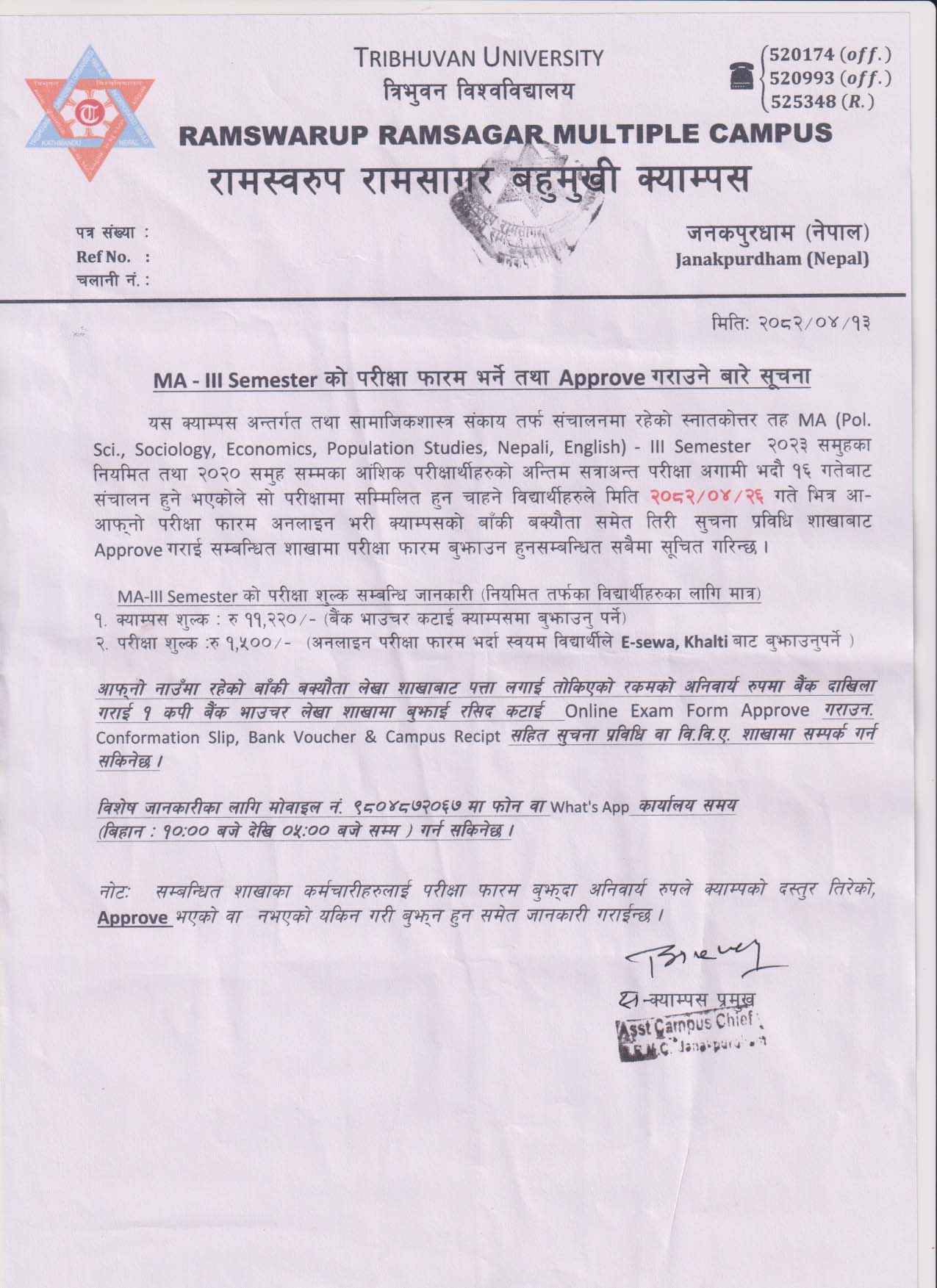 Updated MA-III Semester को परीक्षा फारम भर्ने तथा Approve गराउने बारे सूचना