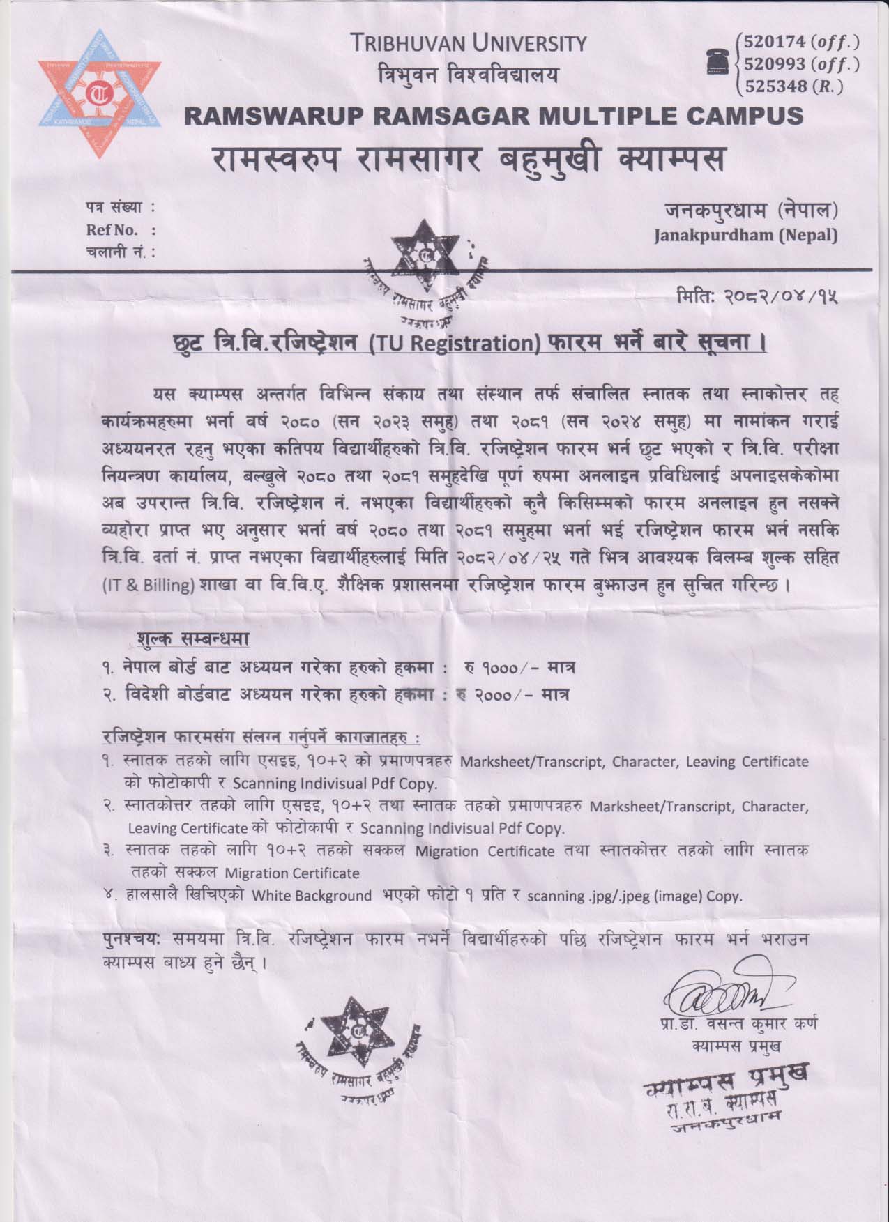 छुट त्रि.वि. रजिस्ट्रेशन (TU Registration) फारम भर्ने बारे सूचना
