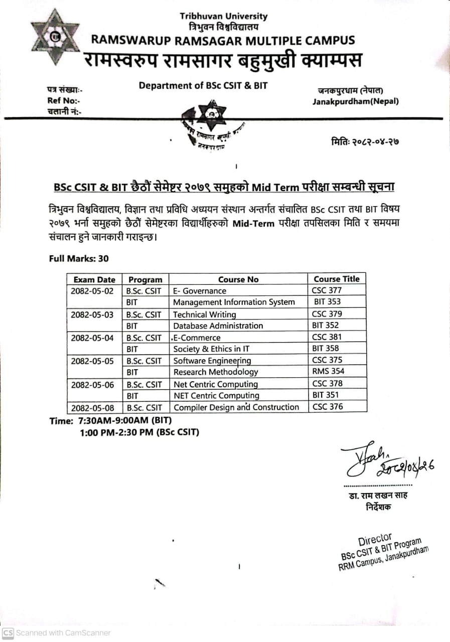 BSc CSIT & BIT छैठौं सेमेष्टर २०७९ समुहको Mid Term परीक्षा सम्बन्धी सूचना