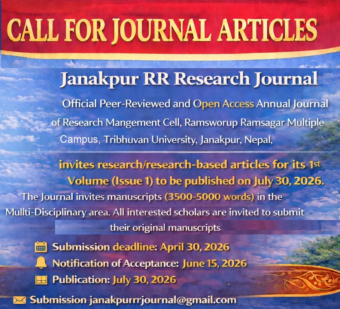 Janakpur RR Research Journal, an official peer-reviewed annual journal of the Research Management Cell, Ramsworup Ramsagar Multiple Campus, Tribhuvan University, Janakpur, Nepal, invites research/research-based articles for its 1st Volume (issue 1) to be published on July 30, 2026. The Journal calls for manuscripts (3500-5000 words) in the Multi-Disciplinary area. All interested scholars are invited to submit their original manuscripts by the given deadlines and address.